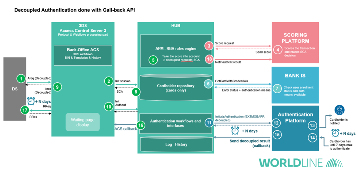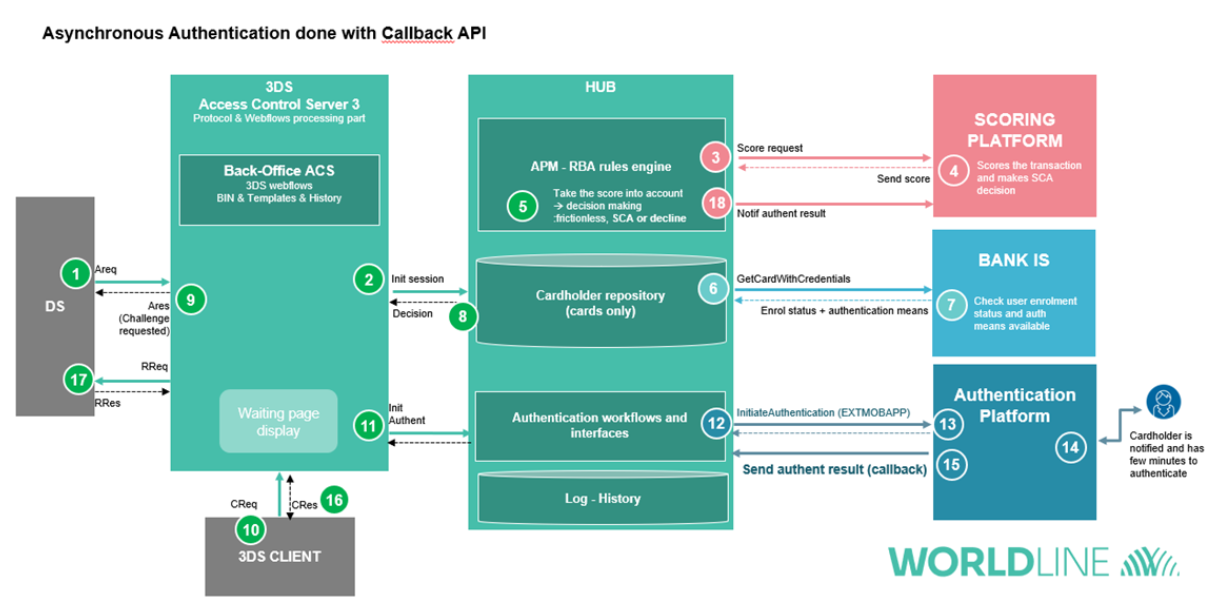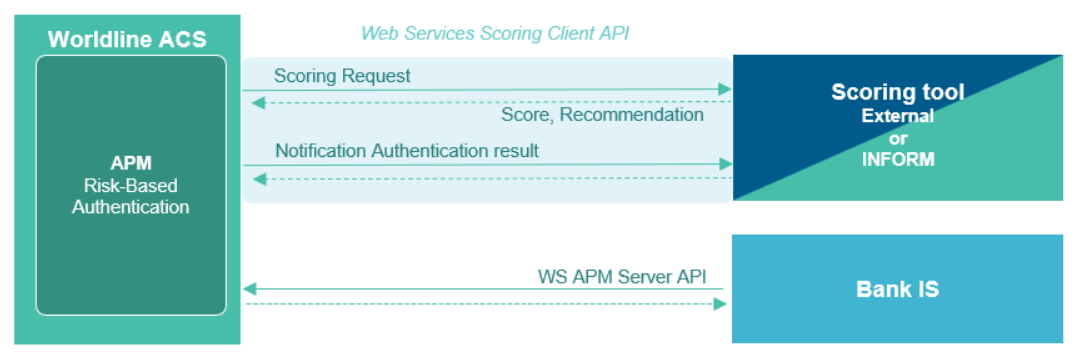 If the bank has a scoring platform, for each incoming transaction (Areq), thanks to scoringRequest, a real time response provides a risk rating (score and indicators).