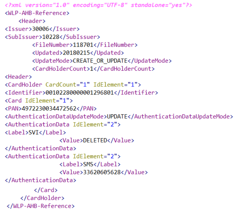 | Equals to SMS, PHONE, EMAIL, PWD, SSN, TOKEN, PAM, DDN, … | AuthenticationData | An unknow authentication mean ([LABEL]) appears in the file (once or more). It will be ignored. | |||